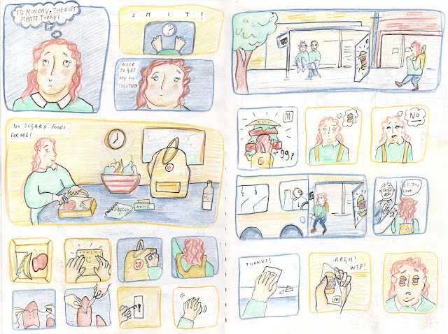 Despite this, I think that when I got on a roll with productivity, my interests and enthusiasm was amplified which lead me to developing new ways of working that I never would have considered before, for example the comic strips showing the reaction and thought processes when trying to lose weight in an environment that is suffocated by consumerism. However this didn't serve me too well when it came to producing the final publication, as I did NOT anticipate the length of time required to produce a comic... which resulted in me rushing a lot of things at the last minute which jeopardised the level of quality within my work.